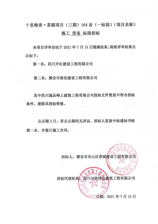 十里梅香茶源項目(三期)164畝施工總承包一標(biāo)段施工勞務(wù)標(biāo)段評審公告